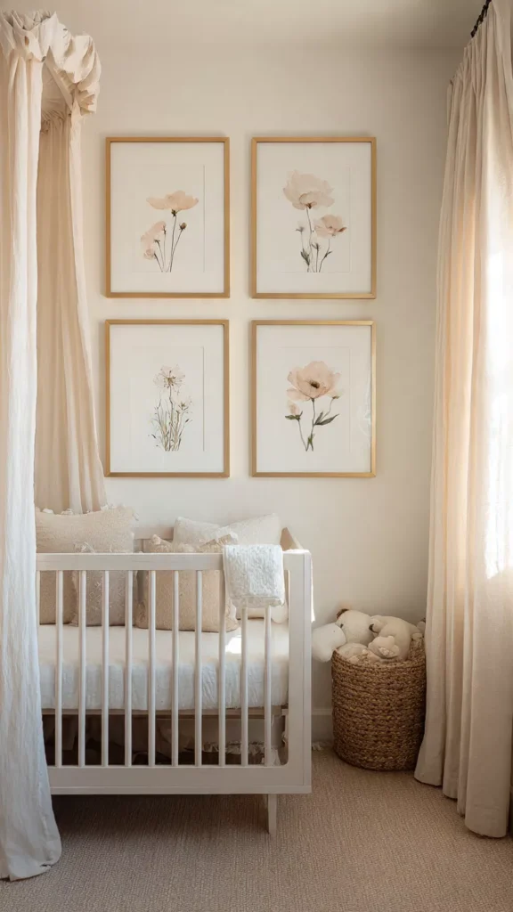 Delicate line drawings—flowers, animals, or sweet figures—create a calm, modern feel. They’re perfect if you love a minimalist nursery style. I love how simple art leaves space for imagination. Doesn’t less sometimes feel like more?