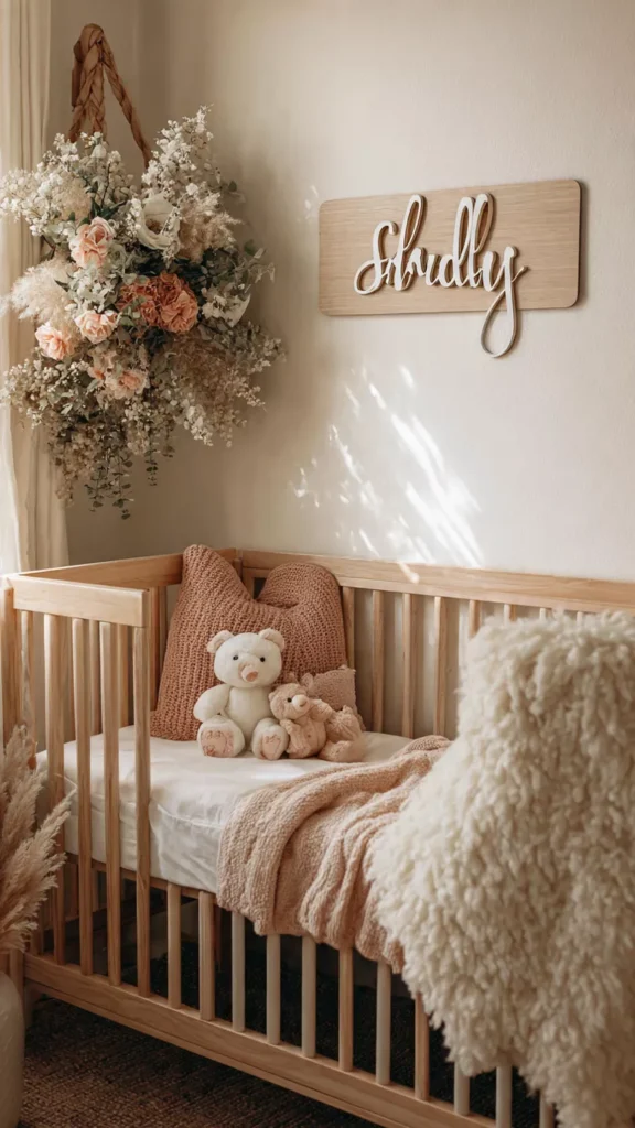 A wooden or acrylic name sign instantly adds warmth and personality to the nursery. It becomes a sweet focal point over the crib or changing table. I always find personalized decor makes the room feel more intentional and loved. Isn’t it beautiful to see her name displayed softly in the space she’ll grow in?
