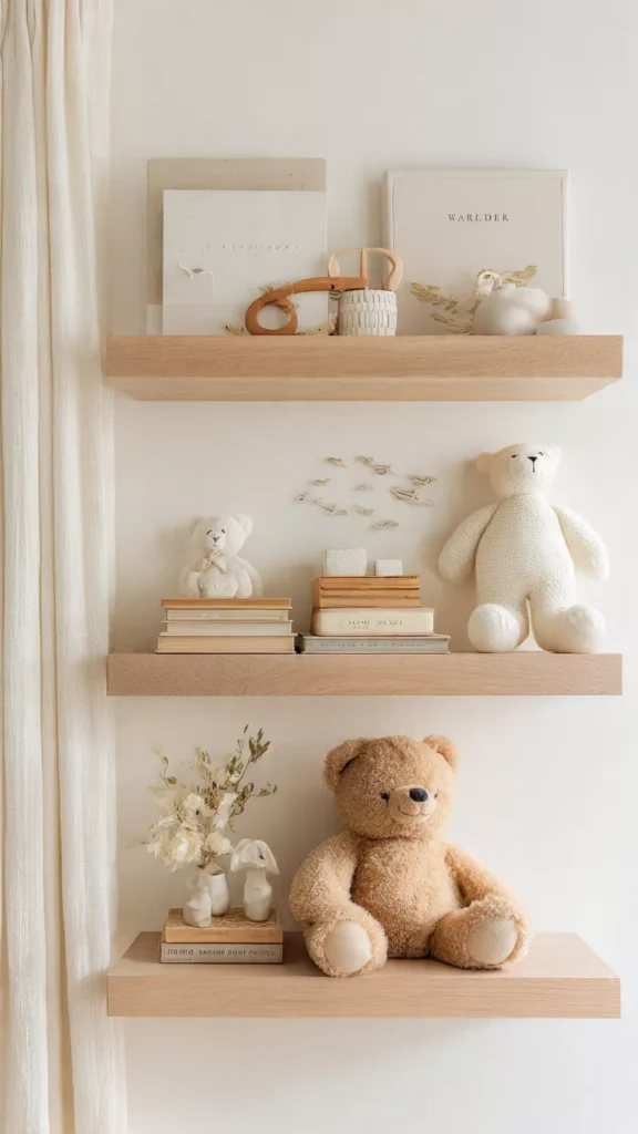 Book ledges double as decor and storage. Displaying picture books with pretty covers adds color while keeping them easy to reach. I always feel like books add personality to a nursery instantly. Don’t stories make rooms feel more meaningful?