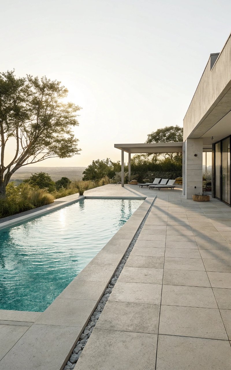 Using light concrete around the pool made the whole area feel brighter, cleaner, and much more open in the sun. The pale finish reflects light beautifully. It keeps the space looking fresh. The material feels modern and easy. It’s simple, but effective. Pro Tip: Choose a textured finish for better grip.