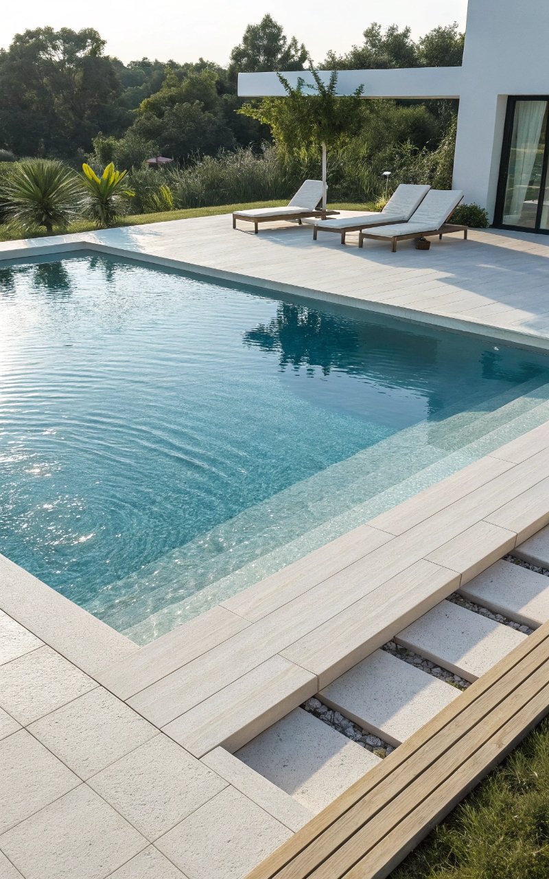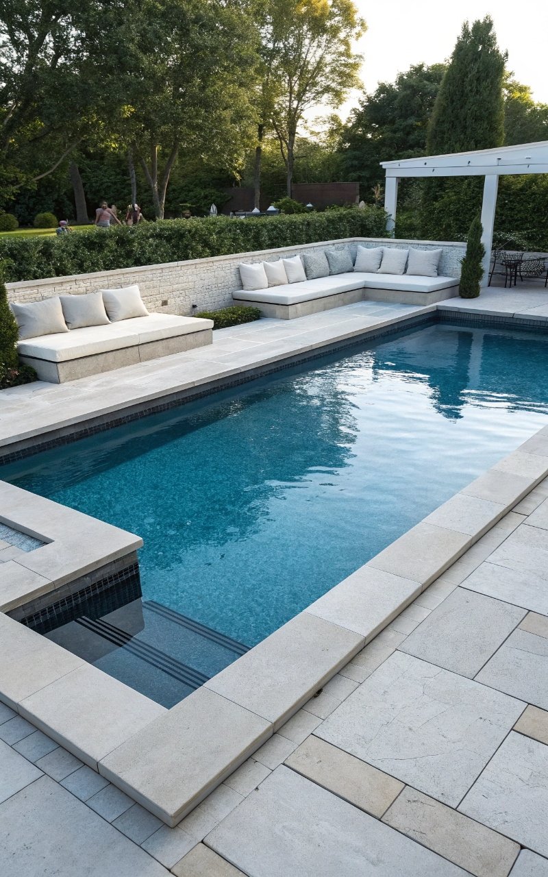 I added a built-in bench inside the pool, and it made the space more comfortable without interrupting the clean layout. The seating feels natural and useful. It adds function without bulk. The pool stays visually simple. It’s subtle, but smart. Pro Tip: Place the bench where it gets partial shade.