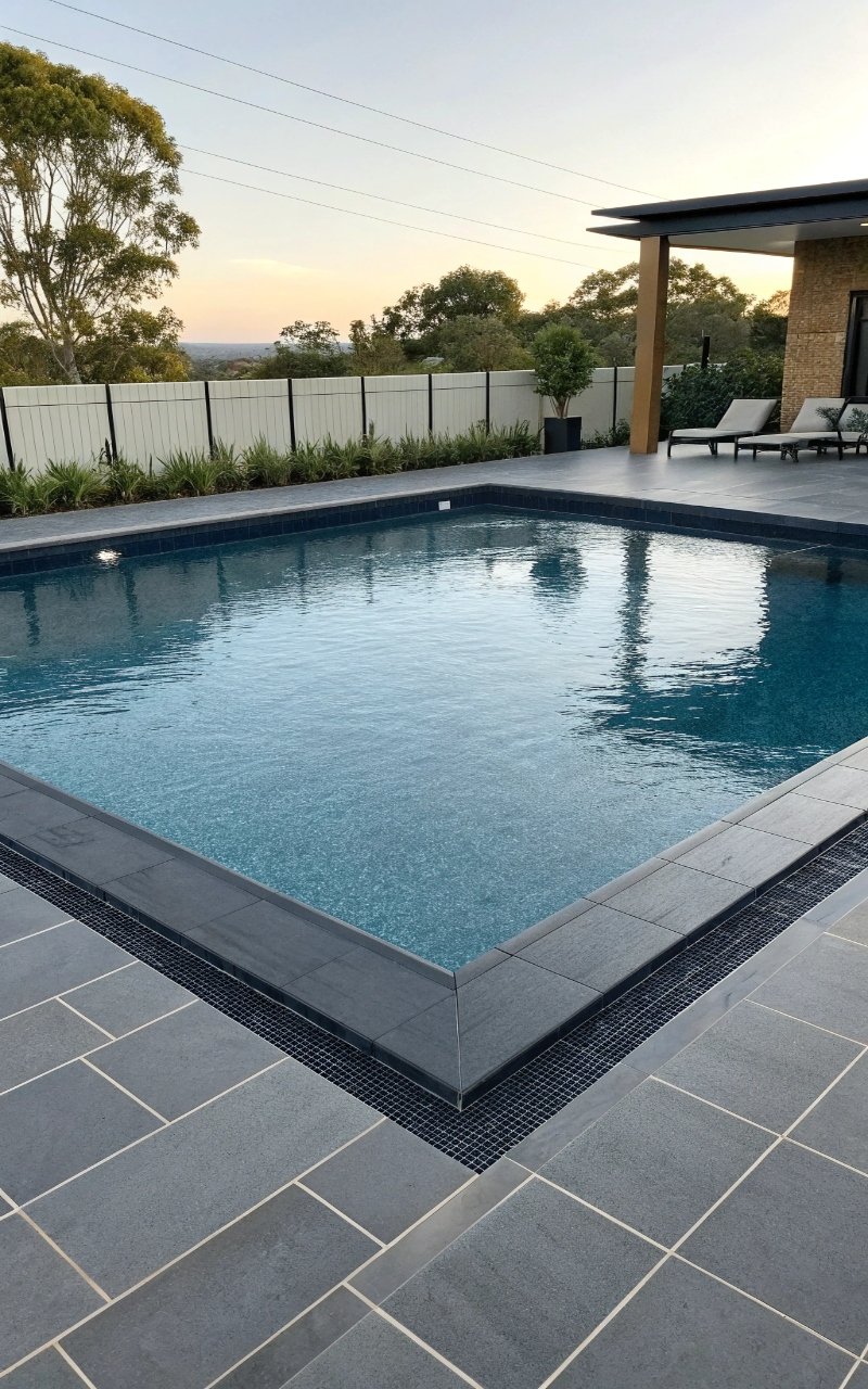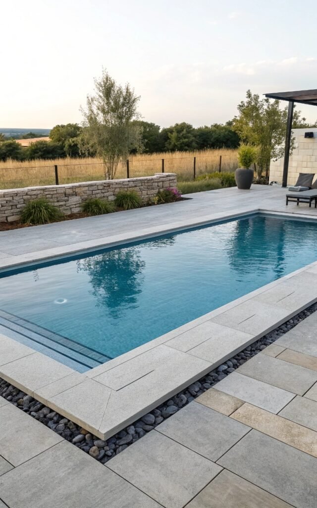 A dark tile band around the waterline added just enough contrast to make the pool feel more finished. The detail sharpens the shape visually. It adds depth without clutter. The contrast feels clean and modern. It’s simple, but noticeable. Pro Tip: Use matte tile for a softer look.