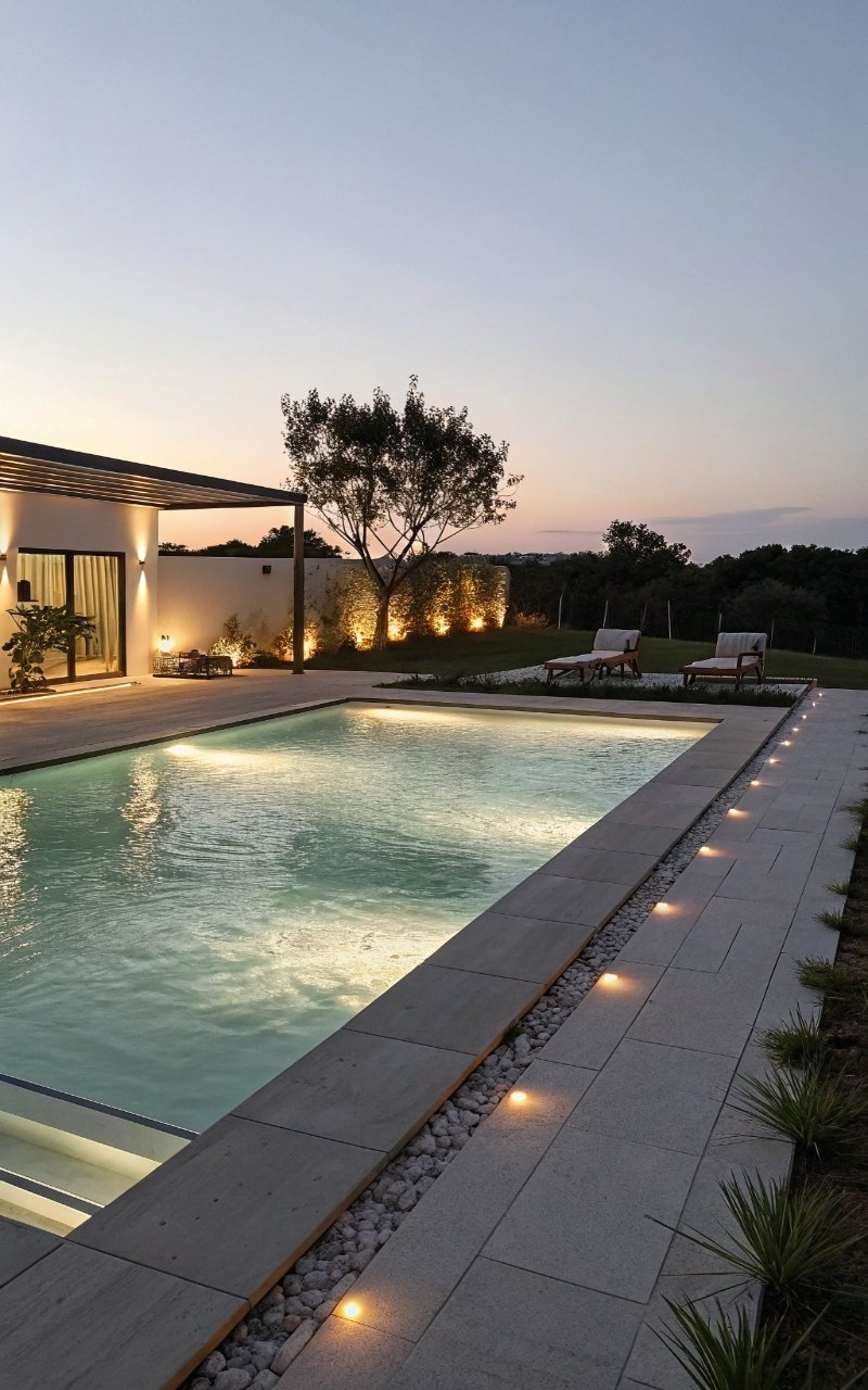 Adding warm white lighting made the pool feel calm and inviting at night without looking too dramatic. The glow softens the water beautifully. It adds just enough atmosphere. The effect feels clean and understated. It’s simple, but beautiful. Pro Tip: Keep deck lighting softer than pool lighting.