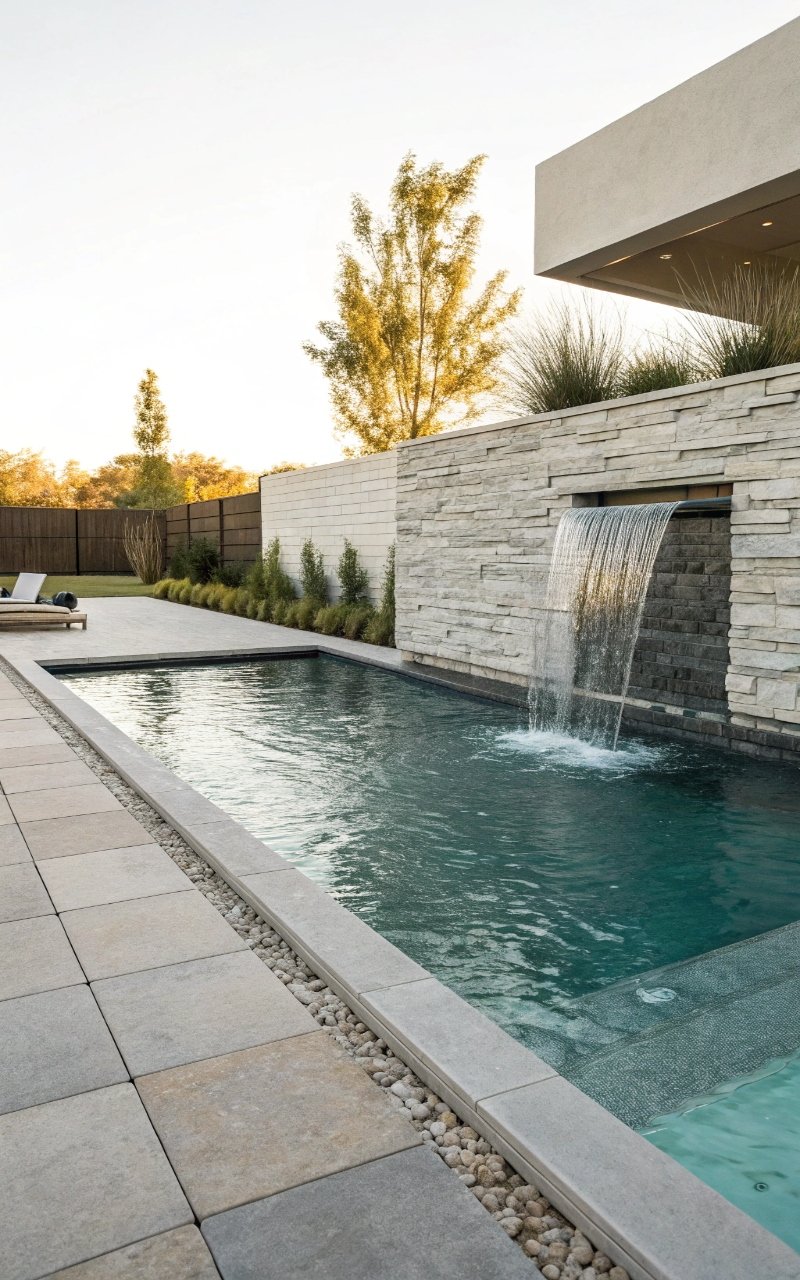 I added one clean waterfall wall, and that single detail gave the pool movement without overcomplicating the design. The sound adds calm immediately. The wall creates a simple focal point. It feels polished and modern. It’s simple, but elevated. Pro Tip: Keep the wall low and clean-lined.