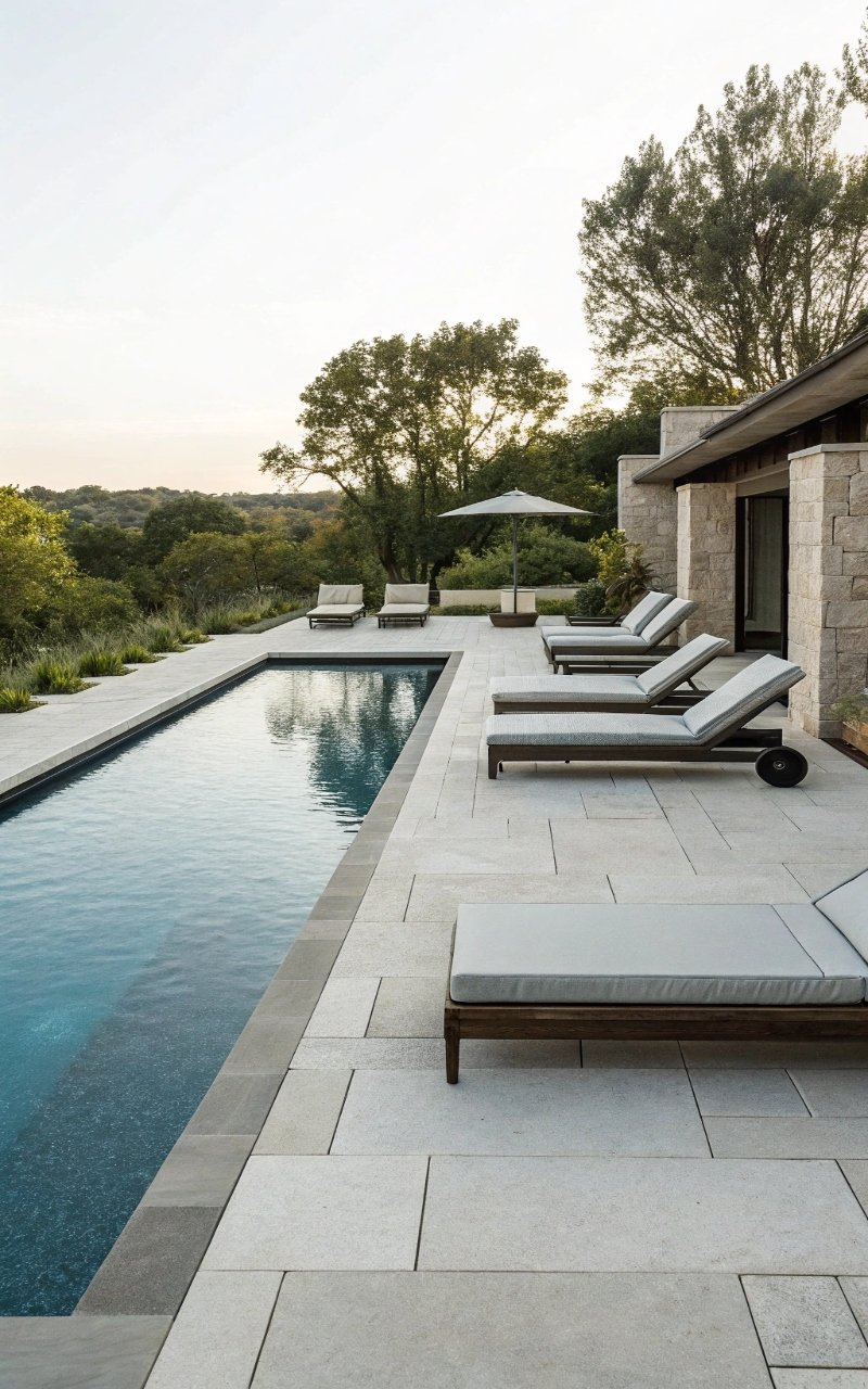 A narrow strip of natural stone added just enough texture to warm up the simpler finishes around the pool. The material softens the overall look. It adds contrast without noise. The detail feels subtle and refined. It’s simple, but effective. Pro Tip: Use stone sparingly for the cleanest result.
