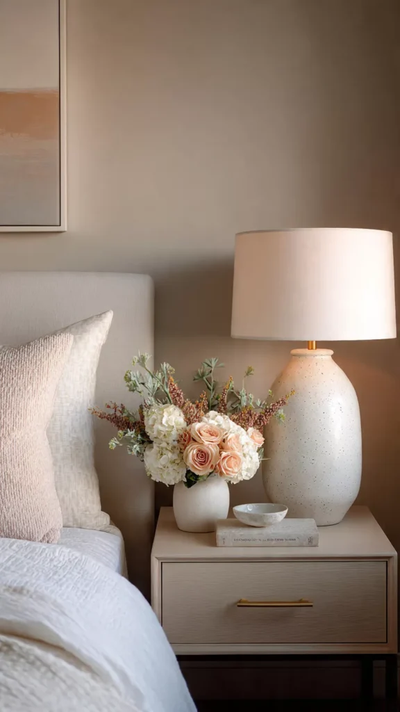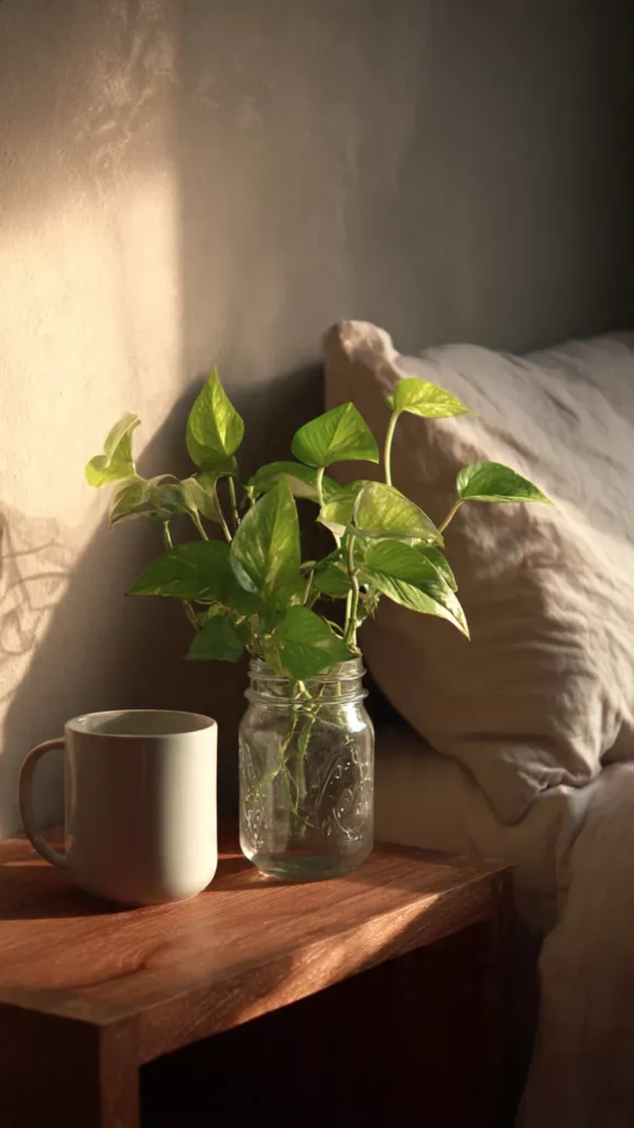 A tiny plant brings life and color to a bedside table. Even a simple pothos cutting in a jar feels refreshing. I always notice how greenery softens hard surfaces. Doesn’t nature make everything feel calmer?