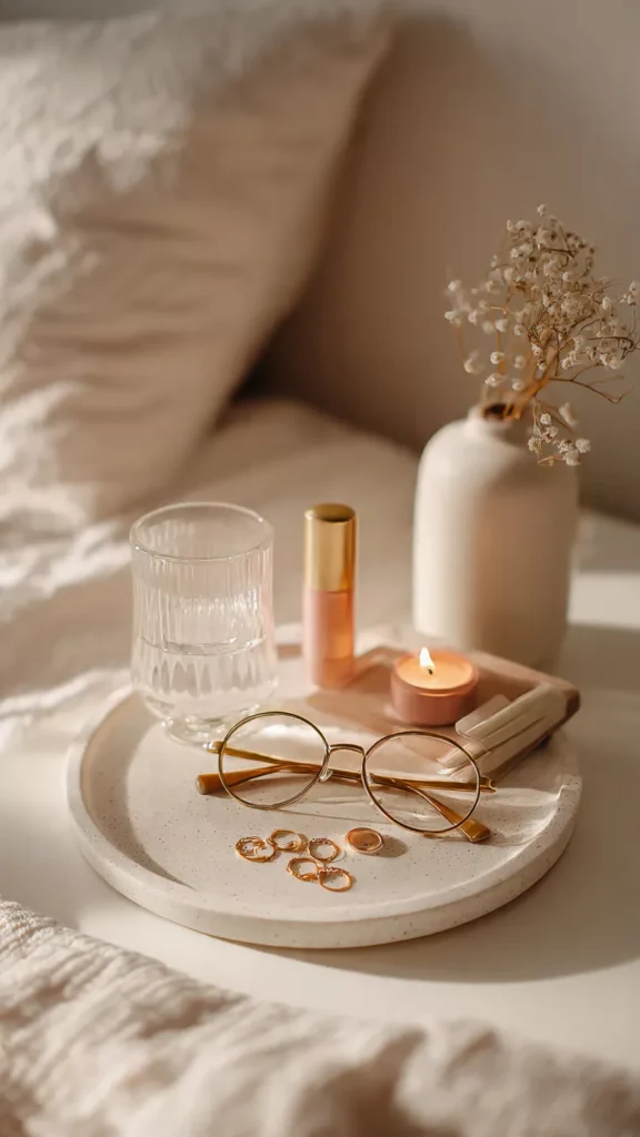 A small tray works like magic on a bedside table. It corrals everyday items—lip balm, glasses, jewelry—so the surface feels tidy and styled. I’ve found that even basic trays look elevated when styled thoughtfully. Doesn’t contained clutter feel instantly calmer?