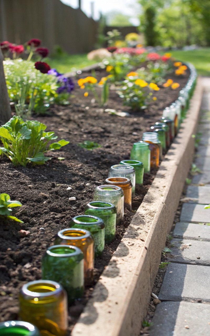 This one started as a fun experiment using empty glass bottles, and it quickly became one of the most eye-catching features in my garden. I pushed the bottles upside down into the soil, letting the colors catch the sunlight, and suddenly the border sparkled in the afternoon light. It felt playful and creative, like the garden had a bit of personality shining through. Plus, it’s a great way to reuse materials instead of tossing them out. It’s a little quirky, sure, but in the best way possible.