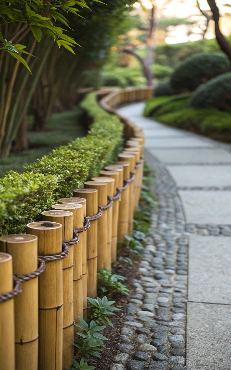 I added bamboo pieces along a pathway once, and the whole area instantly felt calmer, almost like a little retreat tucked into the yard. The vertical lines create a gentle rhythm that draws your eye without overwhelming the space. It pairs beautifully with greenery and gives off a peaceful, balanced vibe. Plus, bamboo is lightweight and easy to work with, which makes the setup pretty straightforward. It’s simple, but it hits different when you see it in place.