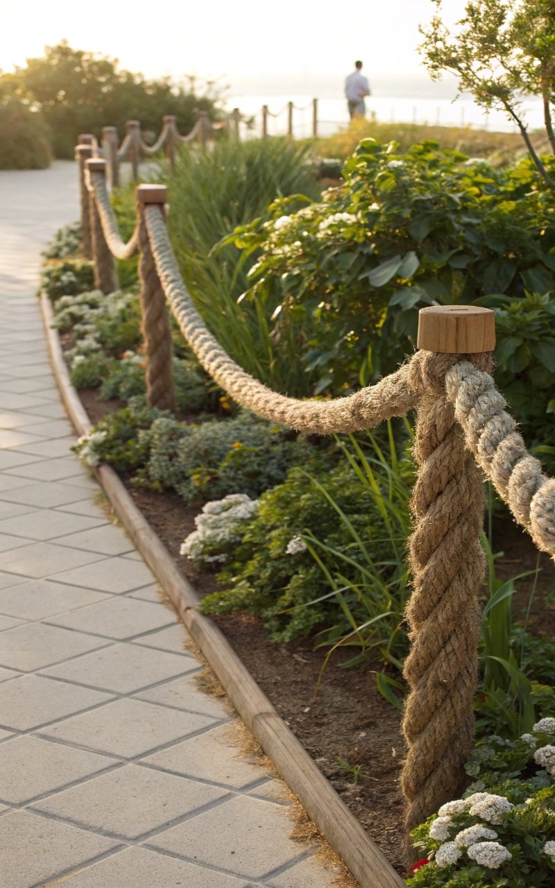 I tried using thick rope once, just to experiment, and it gave the garden this relaxed, beachy feel that instantly made the space more inviting. Draped along small stakes, the rope created a soft boundary instead of a rigid one. It’s perfect if you want something a little different that still feels intentional. The texture adds interest without overpowering the plants, which is honestly a sweet balance. It’s simple, affordable, and kind of unexpected in a really good way.