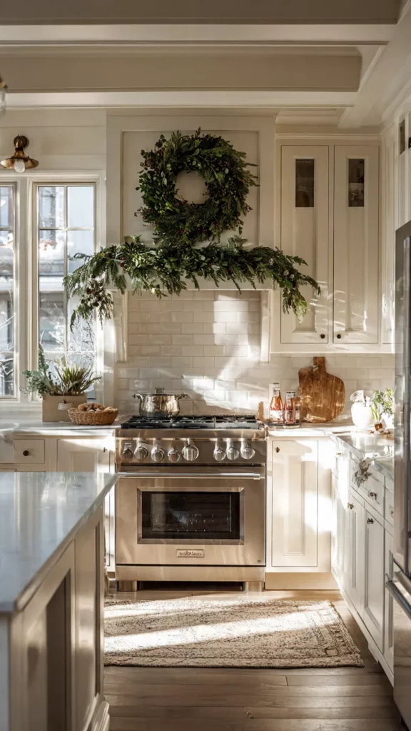 A wreath above the stove adds warm texture, hints of greenery, and a nostalgic focal point that instantly softens the kitchen and makes it feel ready for the season. I love choosing wreaths with eucalyptus or berries because they bring that subtle winter charm without overwhelming the room, and they look even better when sunlight hits them in the afternoon. The wreath becomes a tiny holiday moment you see every time you cook, almost like the kitchen is quietly cheering you on. And really, who wouldn’t want a little Christmas spirit watching over their simmering soups and baking cookies?