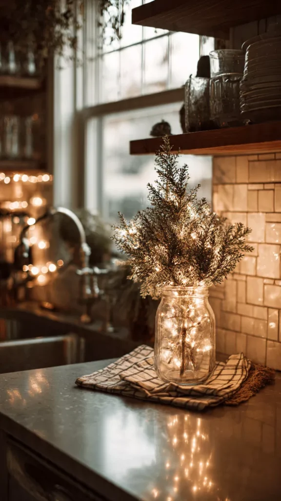 A small countertop tree brings soft glow, vertical interest, and a sweet hint of nostalgia to a space that often gets overlooked during decorating. I always tuck a mini tree near the backsplash where it catches the light and makes the whole kitchen feel inviting, especially during early morning coffee moments. Even the humblest little tree can feel magical when the lights bounce off the tile or stainless steel. At night, the sparkle turns the kitchen into an intimate, cozy space—almost cinematic.