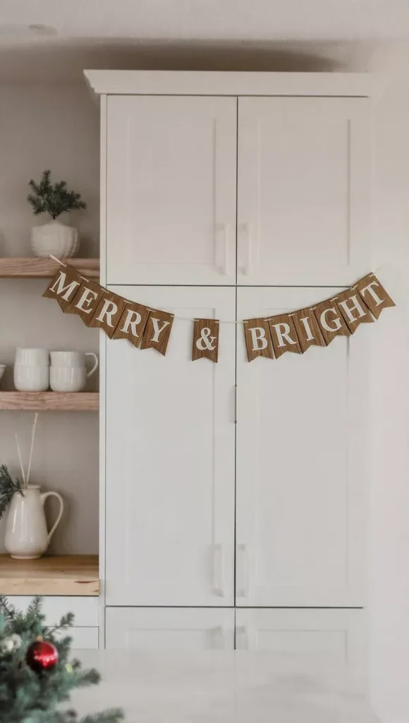 A banner or sign brings personality, texture, and instant holiday charm to walls, cabinets, or open shelves without taking up functional space. I love hanging simple linen or wooden signs with phrases like “Merry & Bright” or “Warm Winter Wishes” because they bring that cozy, welcoming vibe. Even on the busiest days, glancing at a holiday sign feels grounding, like a soft reminder to slow down and savor the season. And with the right design, banners look timeless instead of trendy.