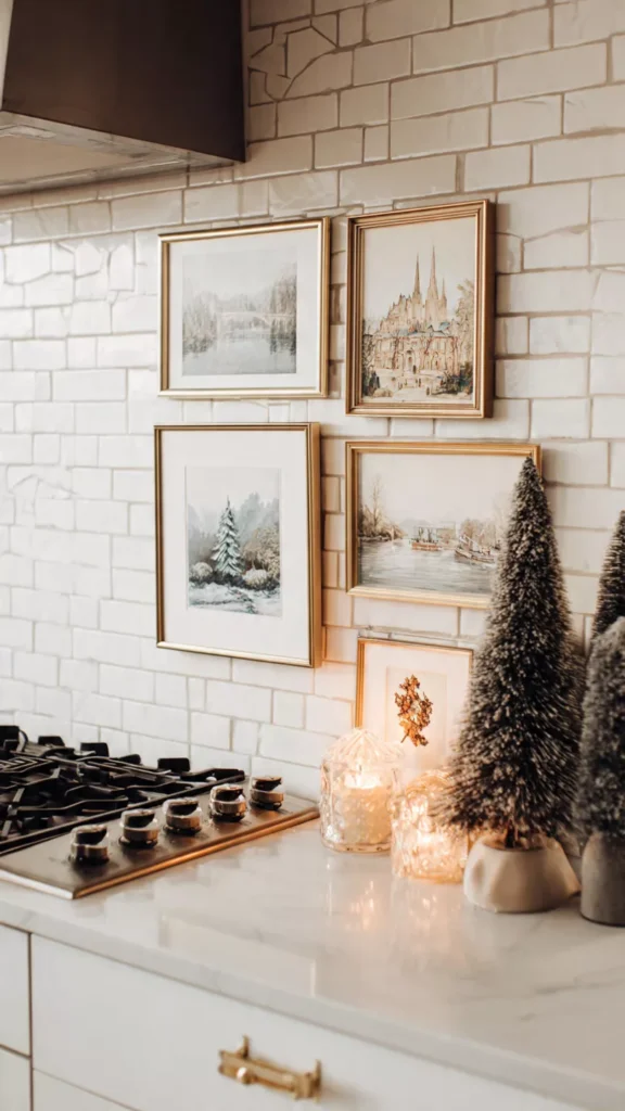 Framing small pieces of holiday-themed art or prints and propping them against your backsplash adds personality without sacrificing space. I love choosing pieces with winter landscapes, vintage illustrations, or simple typography that brings warmth to the room. The art makes the kitchen feel curated, layered, and thoughtfully styled. And since backsplash spaces are often ignored, adding decor there feels surprisingly fresh and charming.