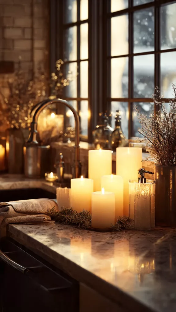 Candles introduce soft glow, irresistible scent, and intimate atmosphere that instantly transform a kitchen into a holiday sanctuary. I love placing candles on the windowsill or counter, letting their flickering light bounce around the room as the scent drifts through the air. When the kitchen glows gently in the evening, it feels like time slows down—almost meditative. Honestly, candlelight is the one thing that makes even quick weeknight dinners feel special.