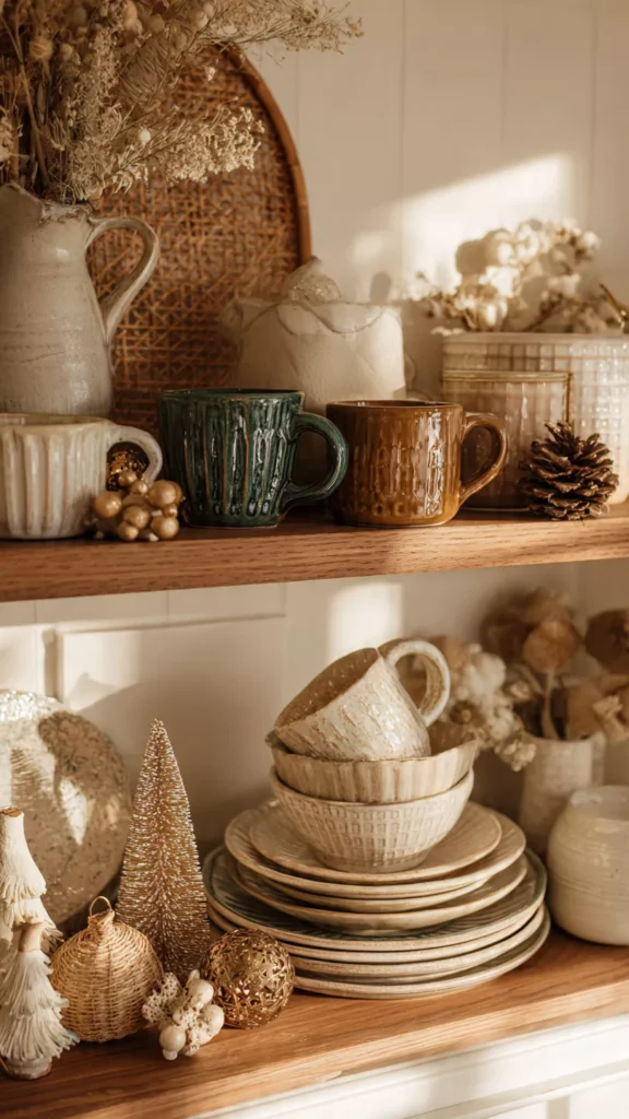 Open shelves become mini festive showcases when you style them with seasonal mugs, tiny ornaments, and warm-toned plates that whisper holiday charm. I love lining up my winter mug collection because guests always ask to choose one, and it turns a simple cup of coffee into a small ritual. Even if your shelf space is limited, a curated row of holiday ceramics adds gentle warmth without creating clutter. And let’s be real: cute mugs make mornings feel way less chaotic.