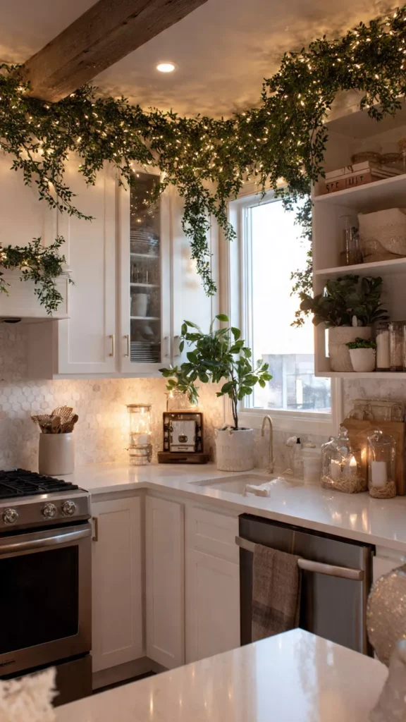 6. Add Garland or Greenery on Upper Cabinets