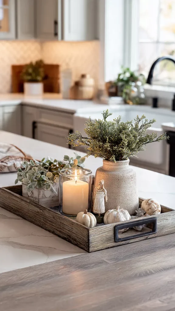 A well-curated tray on the island brings cohesion, warmth, and visual interest without overwhelming your prep space. I love layering a candle, a small vase of greenery, and maybe a sweet seasonal figurine to create a moment that feels festive yet functional. The tray anchors the decor so the island doesn’t look chaotic, and the whole setup feels intentional and welcoming. Plus, when you need full counter space, you can just lift the tray and relocate it—zero fuss.