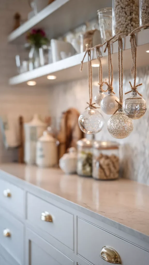Hanging small ornaments from cabinet knobs is one of those fun, quirky touches that instantly makes the kitchen feel joyful without eating up any space. I love using simple ribbon or twine so the ornaments dangle lightly and move when someone walks by, creating a soft shimmer. Guests always comment on this idea because it feels playful and a little unexpected—like the kitchen decided to dress up for the party too. And honestly, it takes five minutes and costs almost nothing.