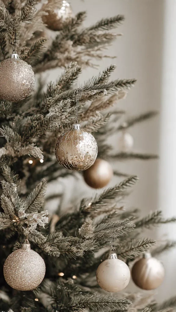 Soft metals like brushed gold or champagne add warmth without overwhelming simplicity. Used sparingly, they bring just enough holiday shimmer. I’ve learned that a little shine goes a long way. Isn’t subtle sparkle more sophisticated? This keeps the tree festive but restrained.