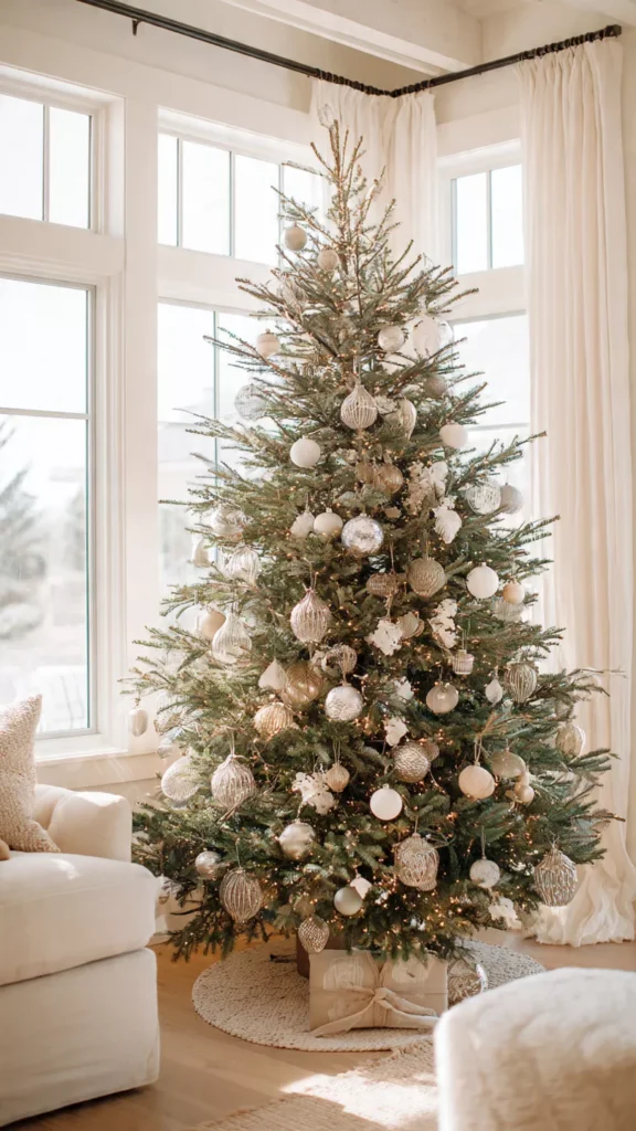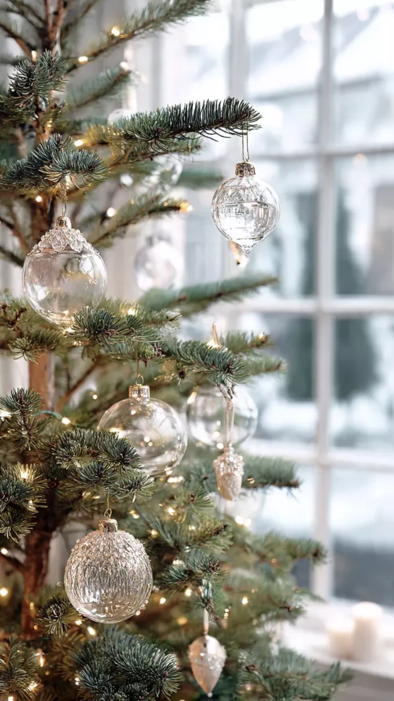 Clear glass ornaments reflect light beautifully without adding color. They keep the tree feeling airy and elegant. I love how they almost disappear during the day and glow at night. Isn’t that kind of magic perfect for minimalism? This choice feels effortless.