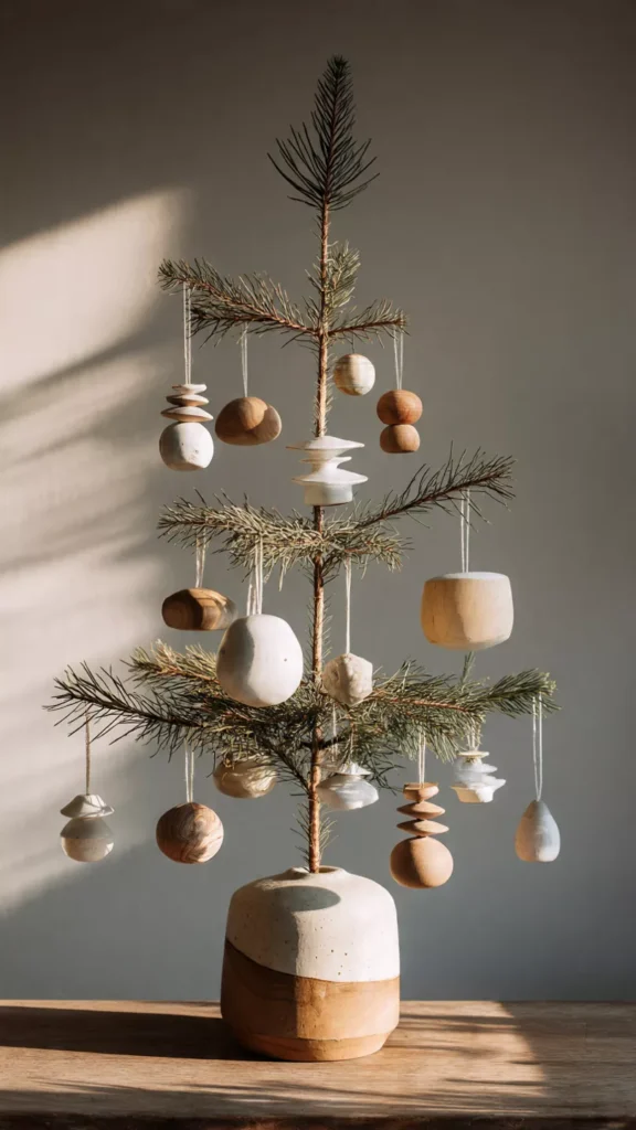Wood and ceramic ornaments add warmth and organic texture to a minimalist tree. They bring a handmade, grounded feel that balances modern simplicity. I’ve always loved how natural materials soften clean design. Doesn’t nature belong in holiday décor? These pieces feel honest and timeless.