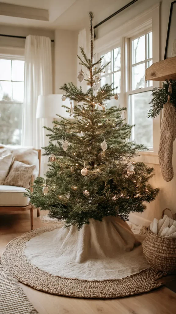 A simple tree skirt grounds the tree and completes the look. Neutral fabrics like linen, wool, or faux fur feel cozy and intentional. I always notice how the base affects the entire tree’s presence. Doesn’t the foundation matter? This detail ties everything together.
