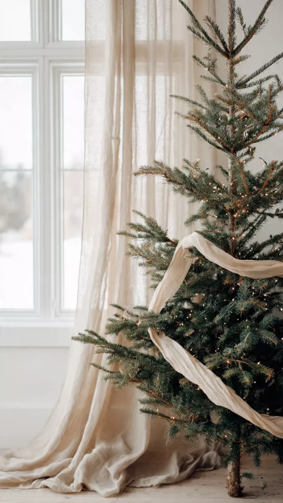 A single ribbon woven loosely through the tree adds movement without excess. Neutral or linen ribbons feel light and elegant. I love how ribbon adds softness without visual weight. Isn’t subtle detail more impactful than layers of garland? This keeps the tree airy.