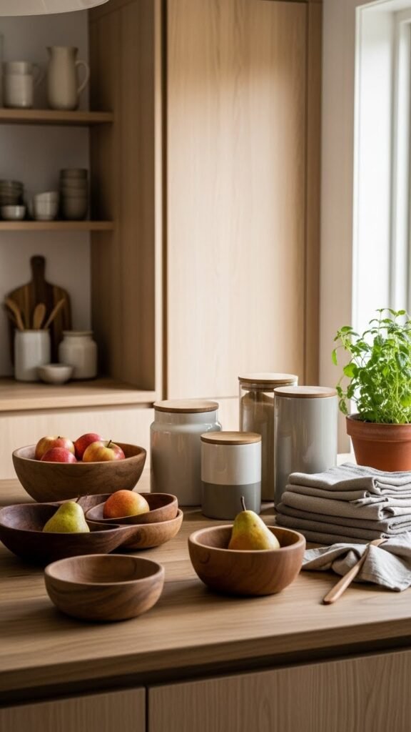 A few carefully chosen decor pieces add personality without clutter. I love wooden bowls, ceramic jars, or linen towels for warmth. Everything feels intentional. The kitchen stays calm and stylish. Doesn’t thoughtful simplicity feel elegant? It’s the final touch.