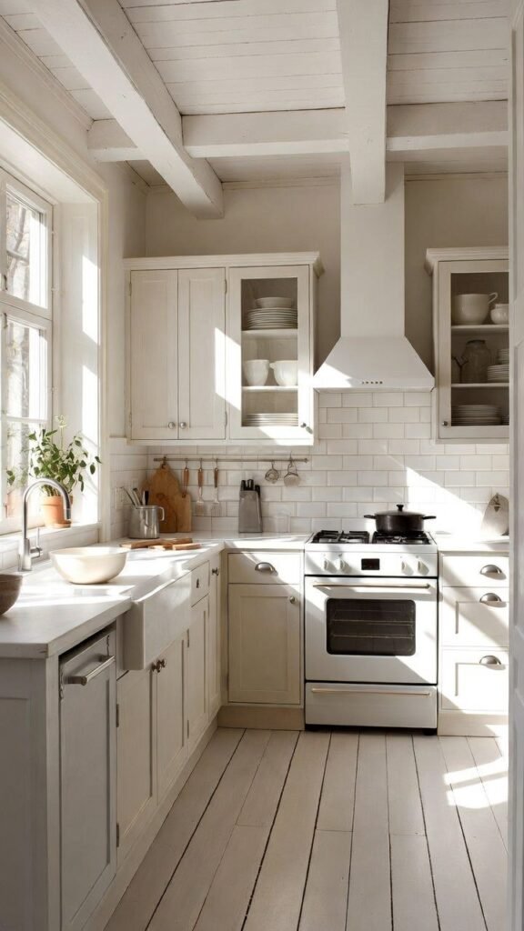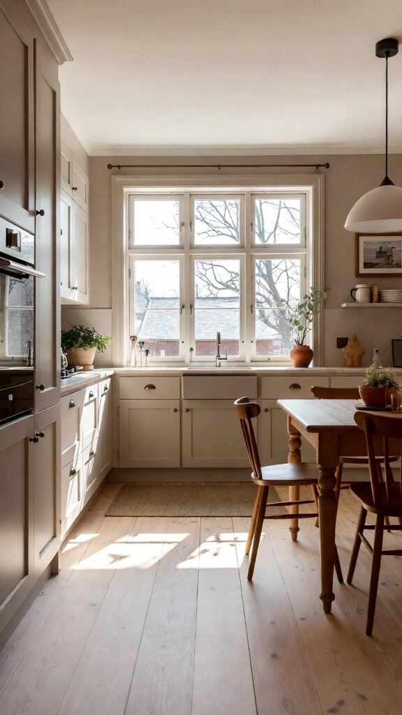 Natural flooring adds warmth and durability to a Scandinavian kitchen. I love how light wood or stone keeps the space grounded. It pairs beautifully with neutral colors. The kitchen feels welcoming. Doesn’t natural texture make everything feel better? It’s a perfect base.