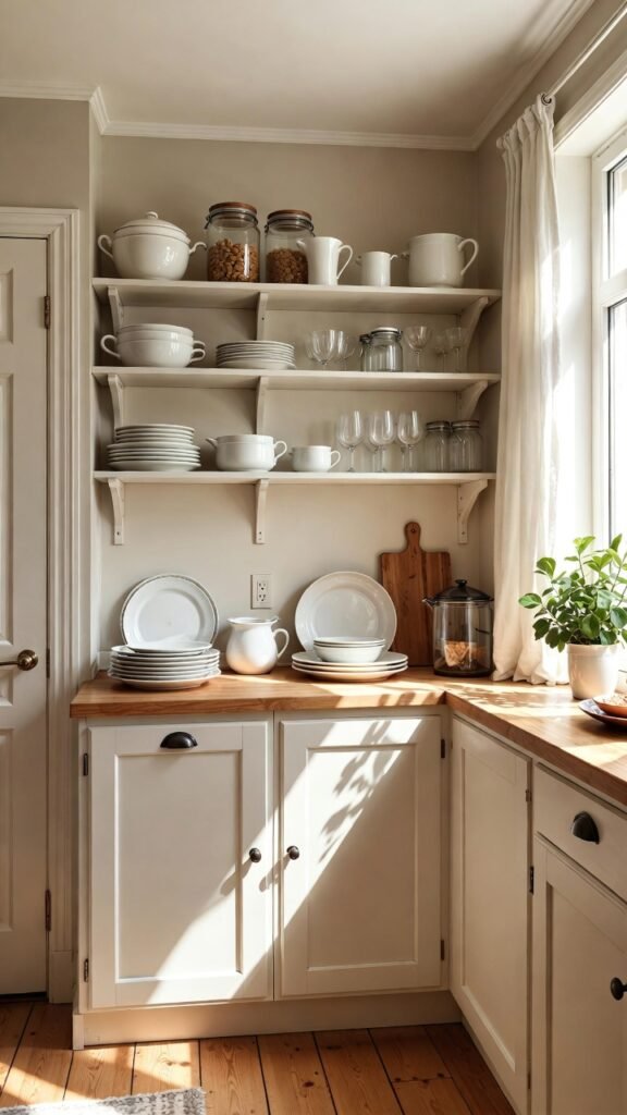Open shelves make a kitchen feel lighter and more spacious. I love how they allow beautiful dishes and glassware to become part of the decor. They also keep things easy to reach. The space feels open and relaxed. Doesn’t seeing everyday items make a kitchen feel more personal? It adds warmth without clutter.