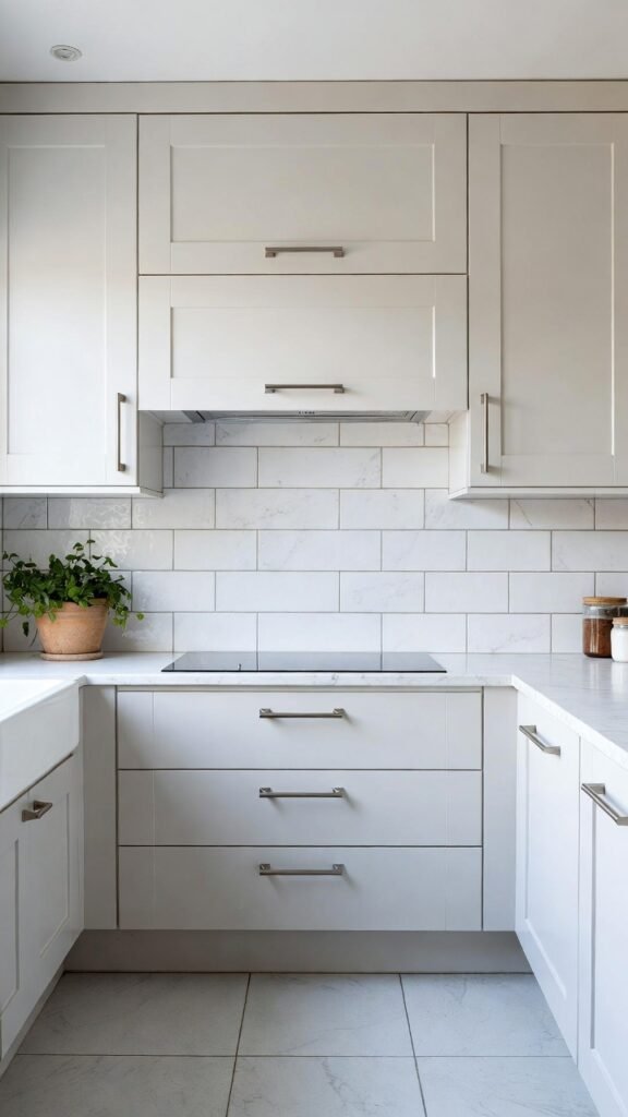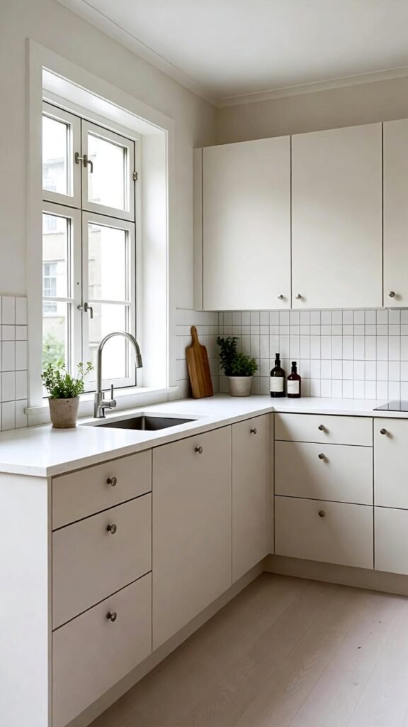 A clean backsplash in white tile or soft stone keeps the focus on the overall design. I love how it adds texture without overwhelming the room. It reflects light and makes the kitchen feel fresh. The look stays timeless. Doesn’t subtle detail feel more refined? It’s perfect for Scandinavian style.