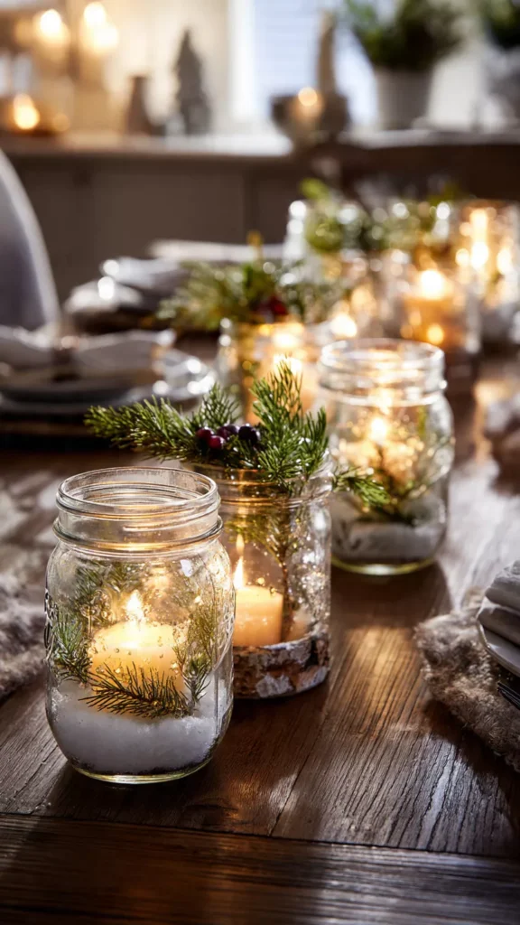 14. Mason Jar Candle Holders with Winter Accents