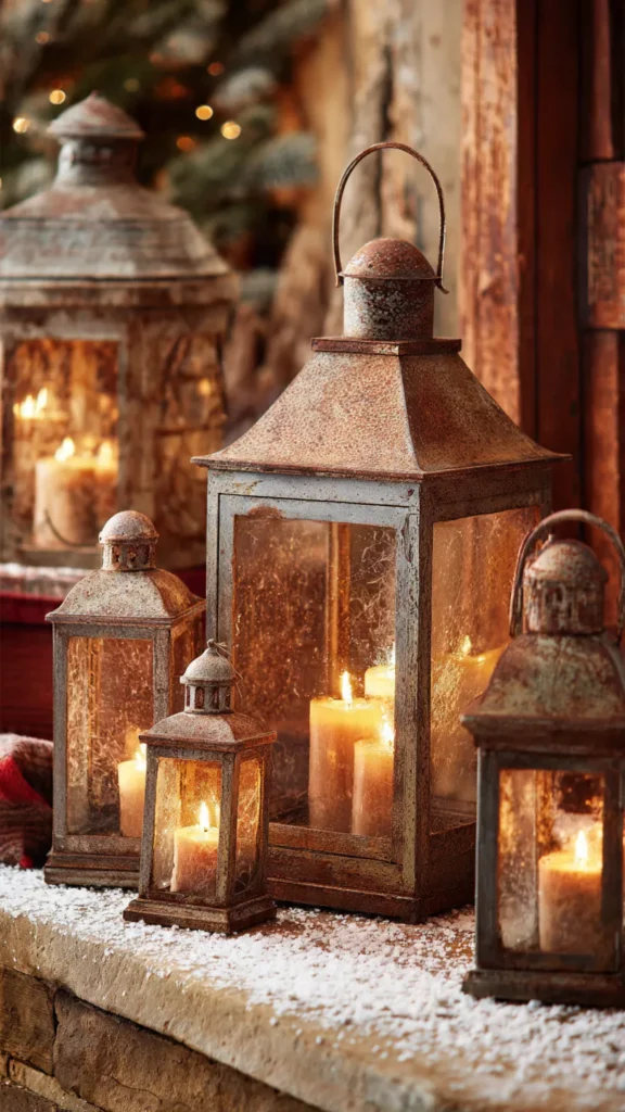 5. Aged Metal Lanterns with Soft Candlelight