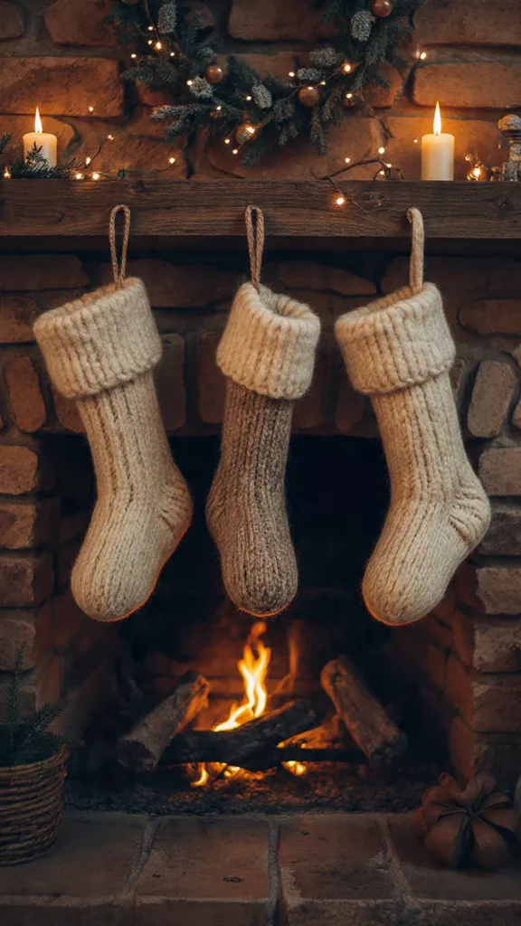 Chunky knit stockings give that “grandma’s farmhouse” vibe—but in a totally stylish way that fits modern homes. Their soft texture and oversized loops feel comforting, like slipping into a favorite old sweater. I always choose neutral tones so the stitching stands out in candlelight, making each stocking feel handwoven and personal. They also balance well with wood, brick, or stone fireplaces, enhancing the natural palette. Isn’t it wild how something so simple can spark so much nostalgia? Rustic holiday décor loves to tug at our heartstrings.
