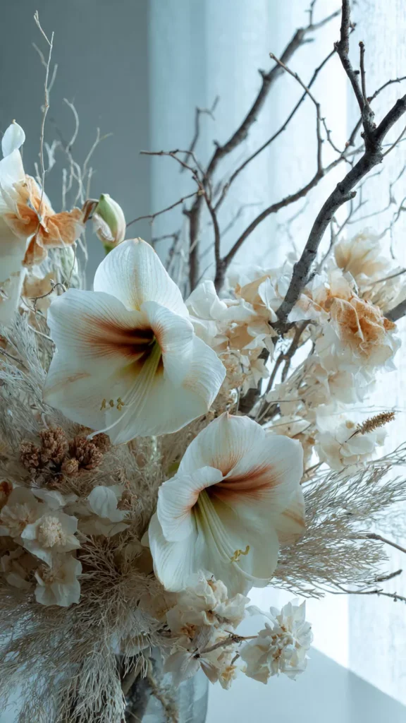 Scandinavian florals stay restrained, focusing on white amaryllis, dried grasses, bleached ruscus, and bare branches. These arrangements feel seasonal without becoming bold statements. They echo winter’s quietness instead of fighting it. I love how they soften spaces without adding color overload. Doesn’t winter beauty feel strongest when it stays gentle? Pro Tip: Keep flower arrangements low to preserve sight lines and openness.