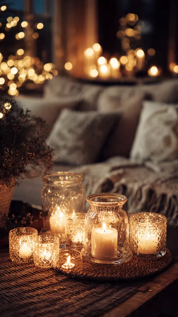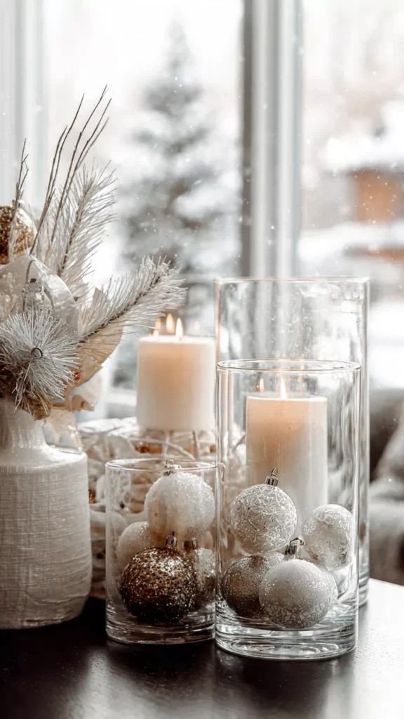 Glass plays a powerful role in keeping Scandinavian décor light and airy. Clear hurricane vases, frosted ornaments, and simple glass candle holders reflect winter light without adding visual weight. They disappear just enough to let greenery and flame stand out. The result feels floating and effortless instead of decorated. Isn’t it wild how invisible décor can still make an impact? Pro Tip: Group glass pieces unevenly to maintain organic balance.