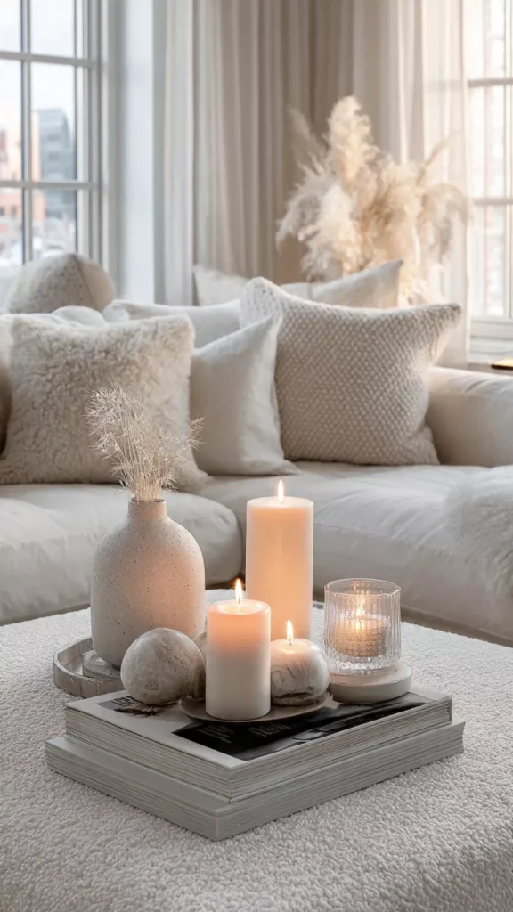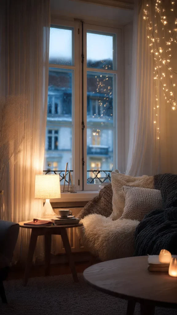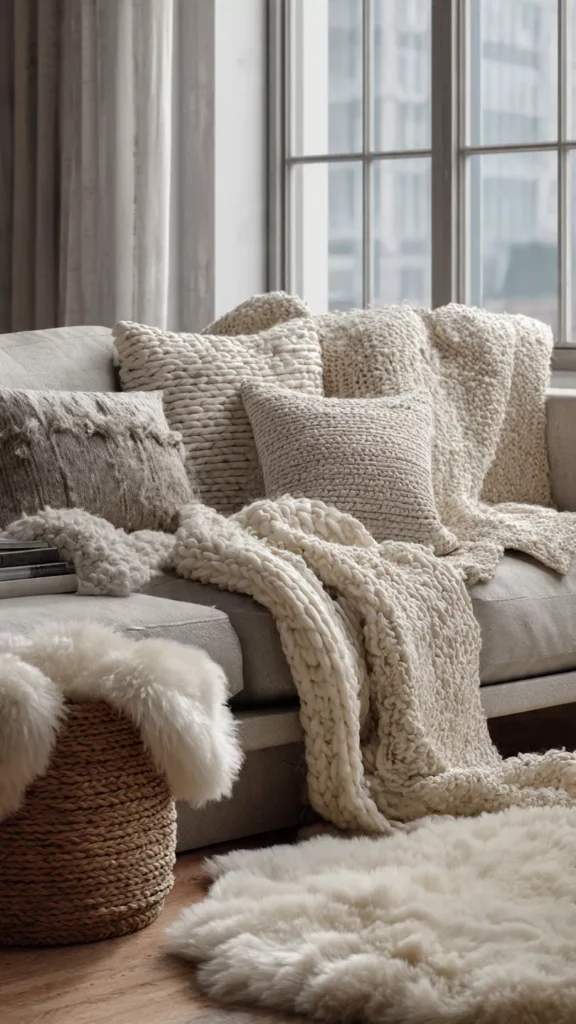 Cozy comes from texture in Scandinavian homes, especially during winter. Chunky knit blankets, wool throws, linen pillows, and sheepskin-style rugs work together to build warmth layer by layer. These textiles invite you to sit longer, slow down, and stay grounded in the season. The room feels wrapped instead of staged. Isn’t physical softness what truly makes a space feel emotionally safe? Pro Tip: Stick to one texture family per room to avoid visual clutter.