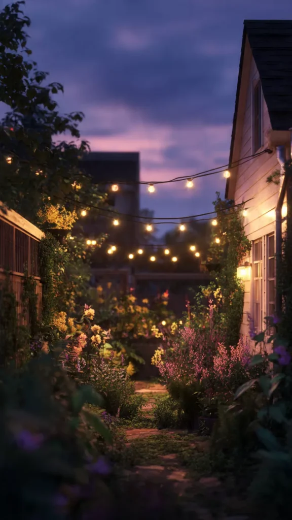 Soft solar or string lights layered with greenery create gentle evening magic. The yard transforms into a peaceful nighttime haven. I always find evening gardens incredibly soothing. Doesn’t glow change everything?