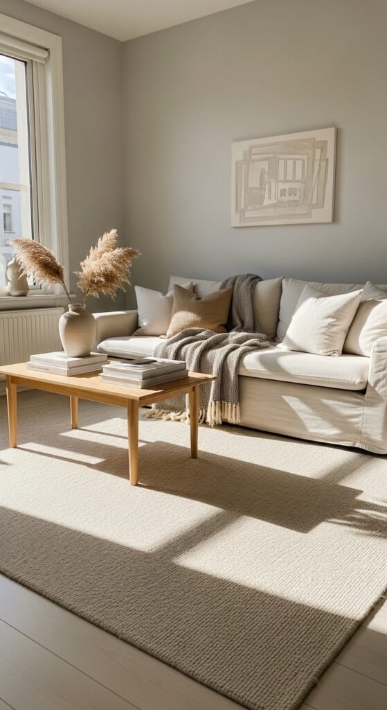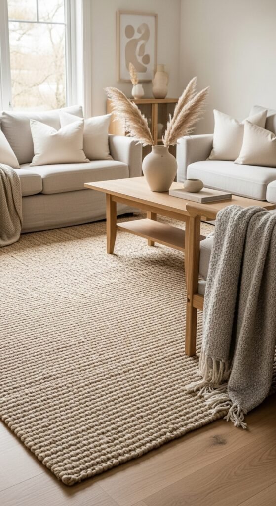 Jute or sisal beige rugs add texture without visual clutter. I love how the natural fibers reflect light unevenly, adding depth while staying neutral. The room feels grounded yet open. Texture feels calm here. Doesn’t organic material always feel breathable? It’s a great balance.