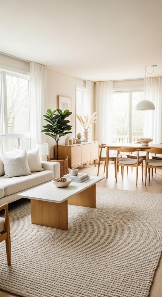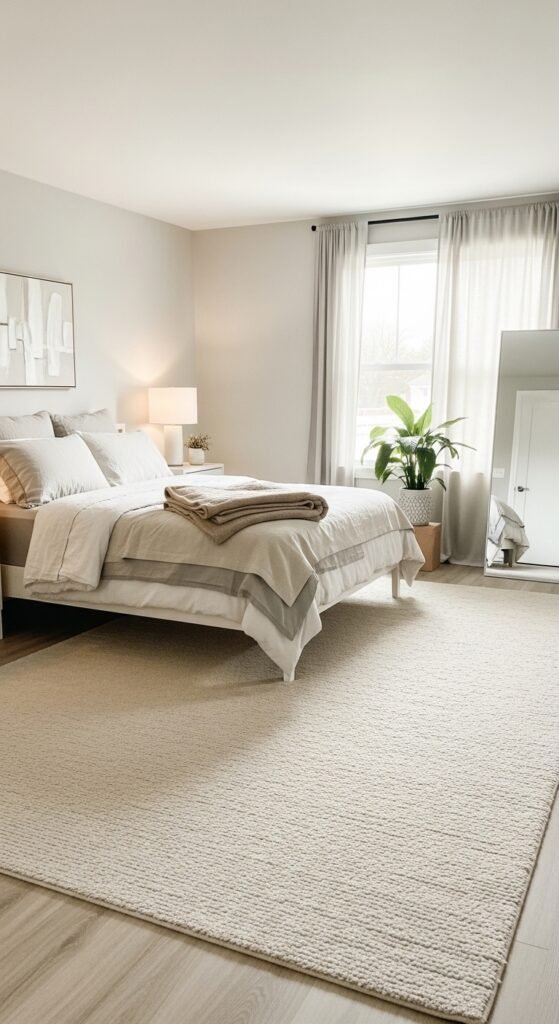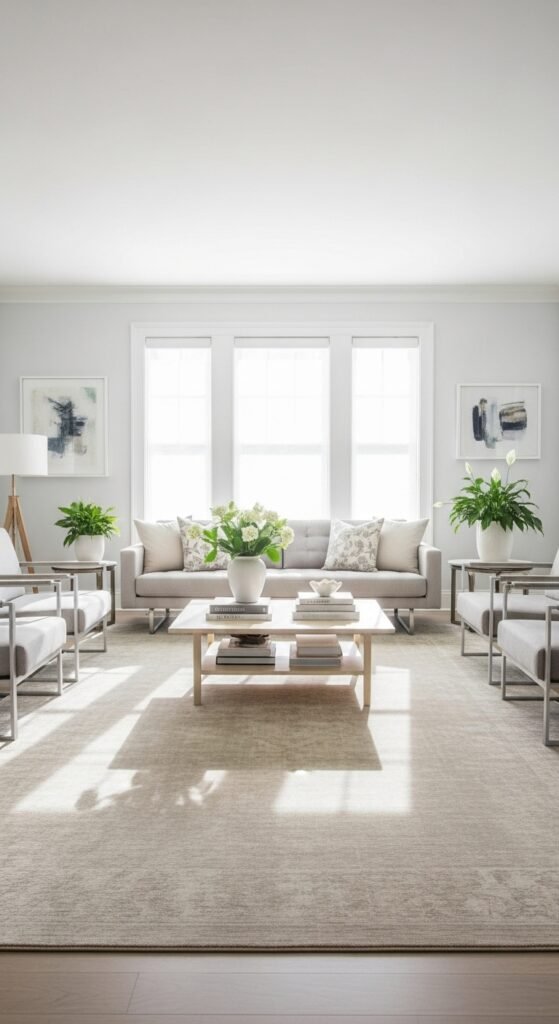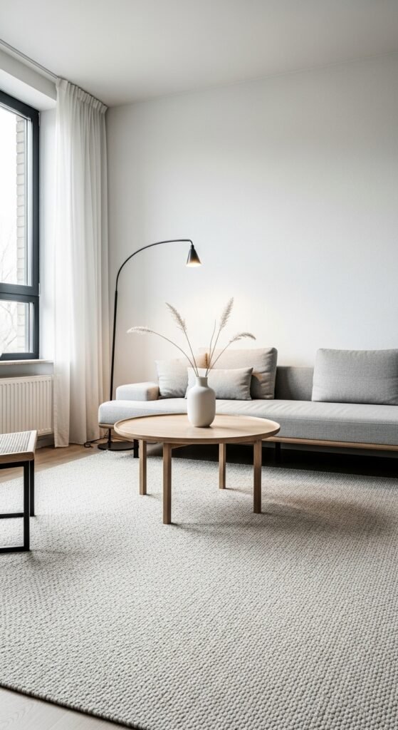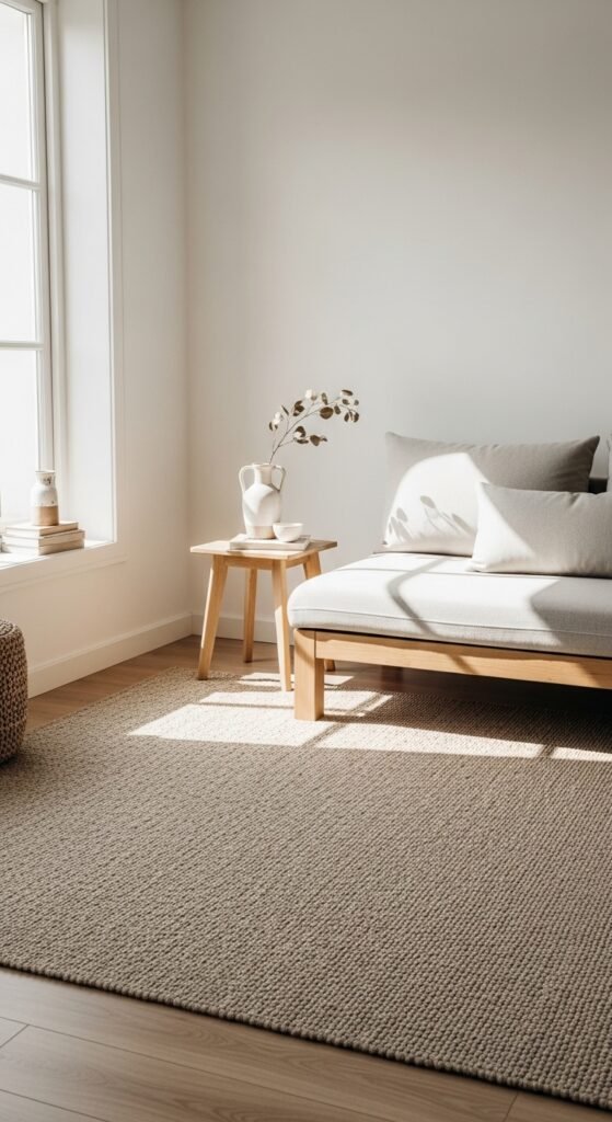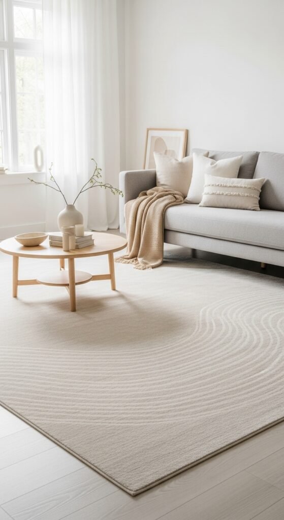 Plain beige rugs create visual rest, which makes rooms feel more spacious. I love how nothing competes for attention. The space feels open and calm. Furniture stands out instead. Doesn’t simplicity make rooms feel larger? Minimalism works here.