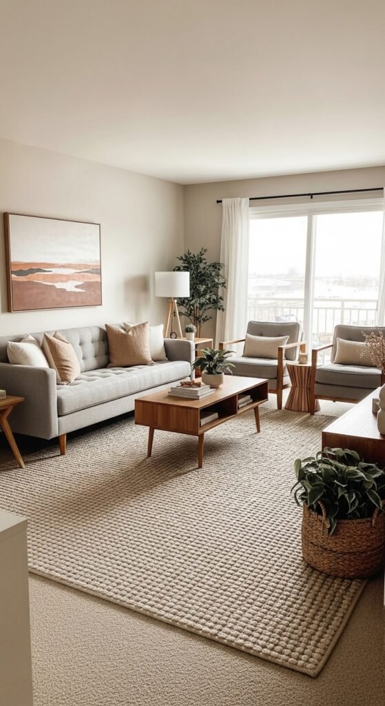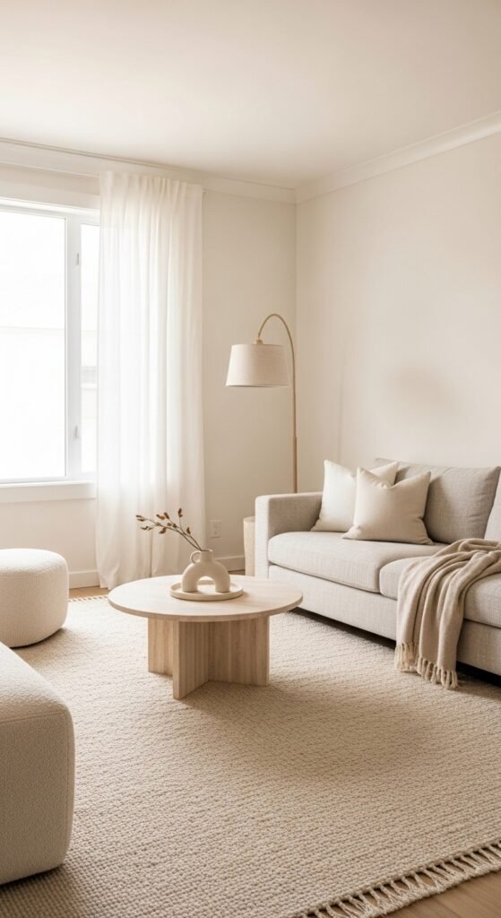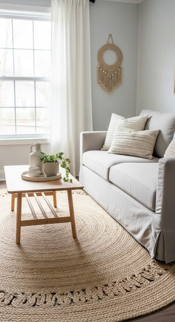 Woven beige rugs add depth without visual weight. I love how texture gives interest without color contrast. The room feels warm and layered. Nothing feels overstimulating. Doesn’t texture add richness quietly? It’s perfect for small rooms.