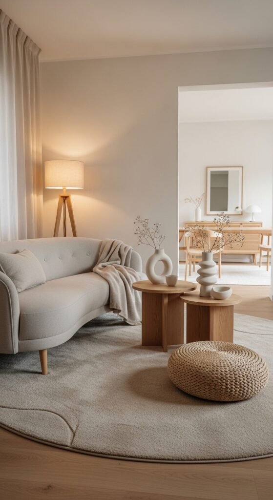 Round beige rugs soften corners and improve circulation in small spaces. I love how they break up boxy layouts. The room feels more open and relaxed. Flow improves instantly. Doesn’t movement make spaces feel bigger? Curves help with that.