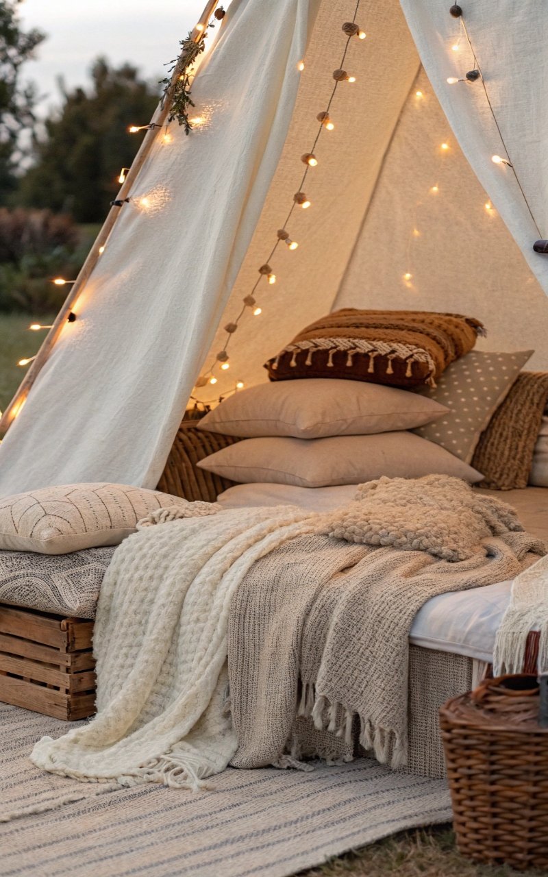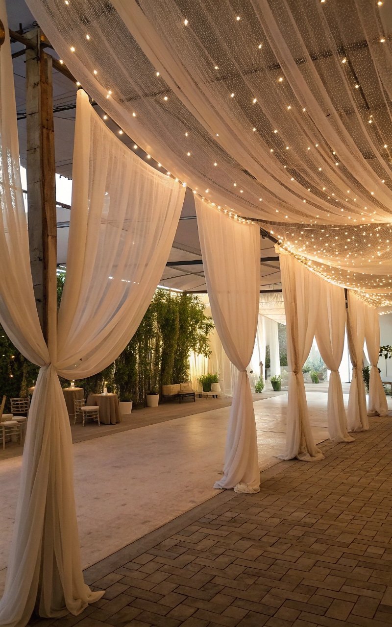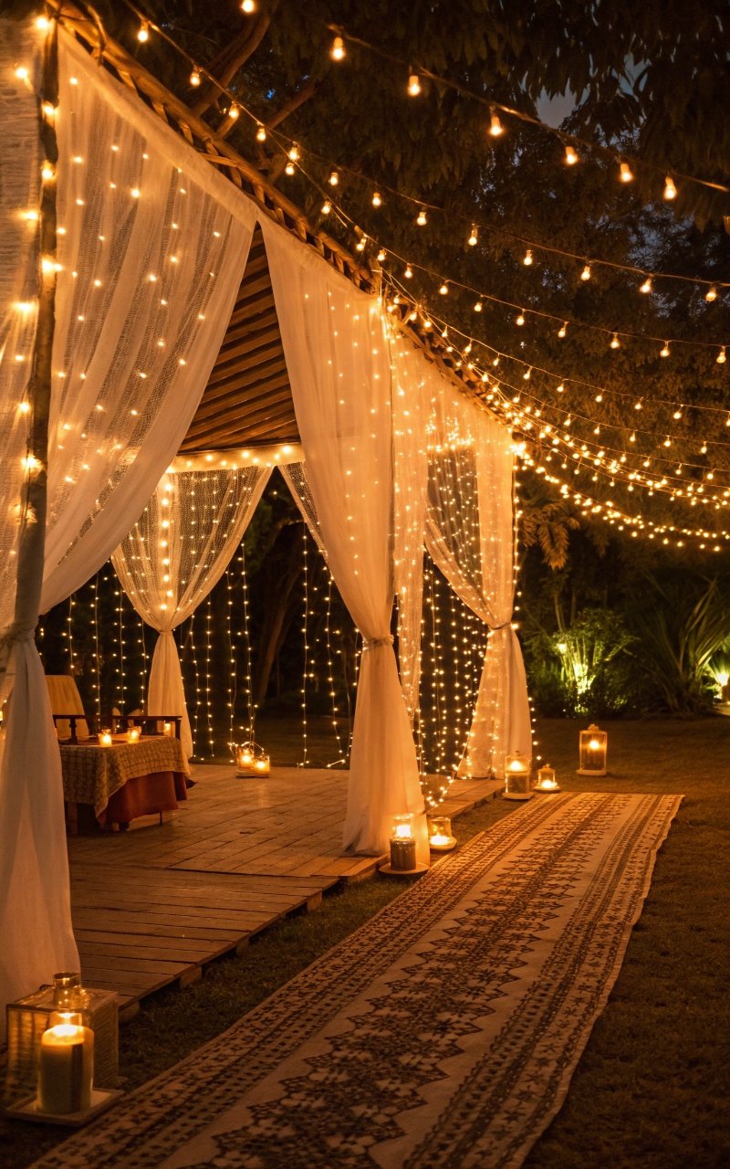 I draped light fabric overhead, and it created a soft, flowing canopy that feels almost magical. The movement adds life to the space. It softens the overall look. The setup feels dreamy and relaxed. It’s a standout feature. Pro Tip: Use sheer fabrics for a lighter feel.