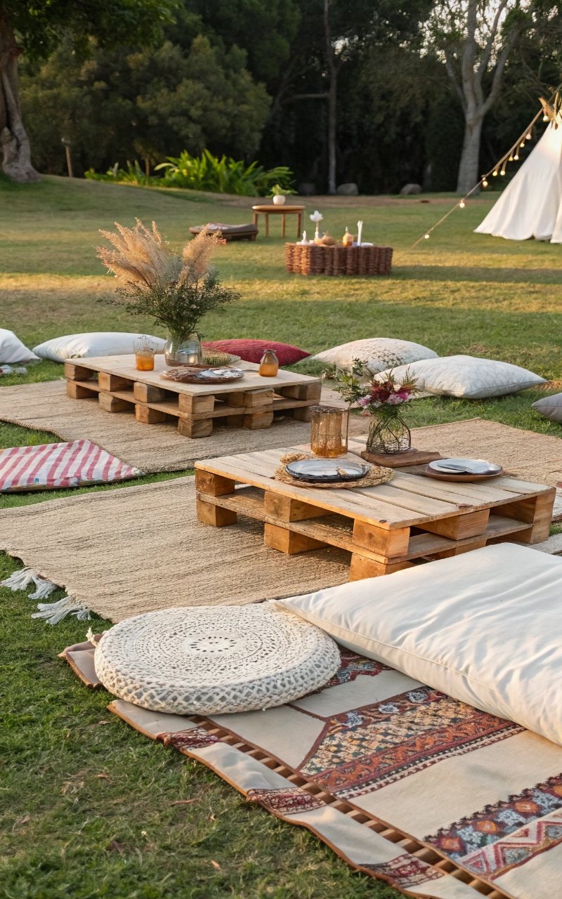 I arranged a picnic-style seating area, and it created a relaxed, communal vibe that encourages connection. The layout feels informal and inviting. It’s perfect for casual gatherings. The setup feels cozy and social. It’s simple, but effective. Pro Tip: Use low tables for convenience.
