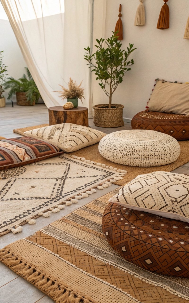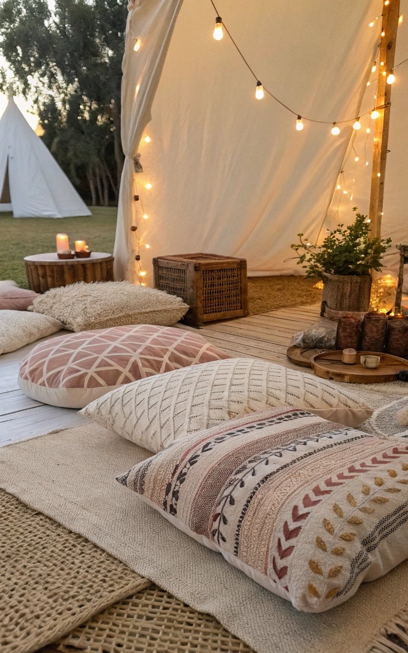 Adding floor cushions created a casual seating arrangement that encourages people to relax and stay awhile. The low setup feels intimate and comfortable. It’s perfect for a laid-back gathering. The softness adds warmth. It’s cozy and welcoming. Pro Tip: Mix sizes and patterns for depth.