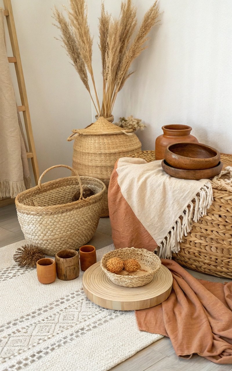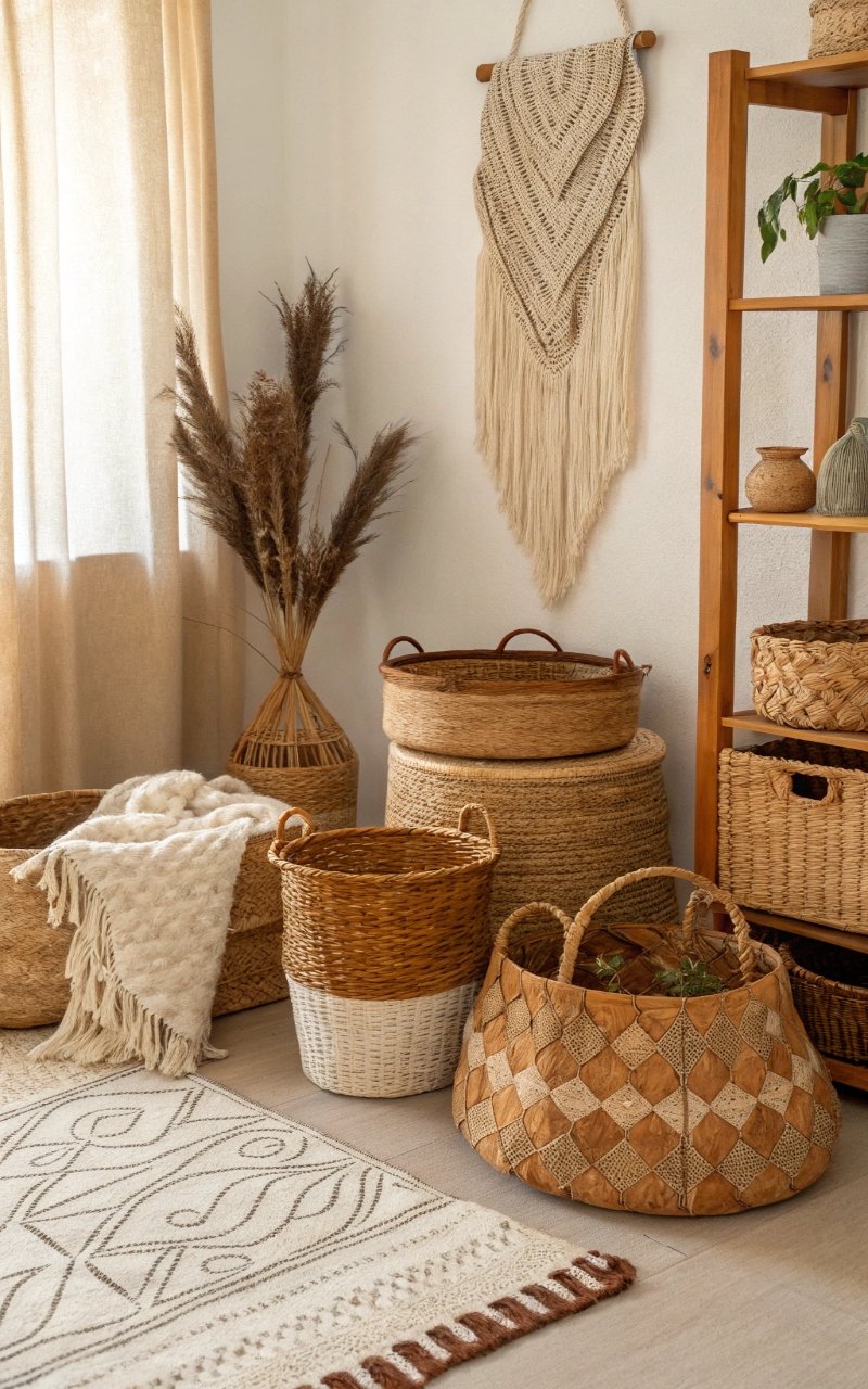 I used woven baskets as both decor and storage, and they added texture that fits perfectly with the boho style. The natural fibers soften the space. It feels relaxed and organic. The baskets are functional too. It’s simple, but effective. Pro Tip: Mix different sizes for layering.