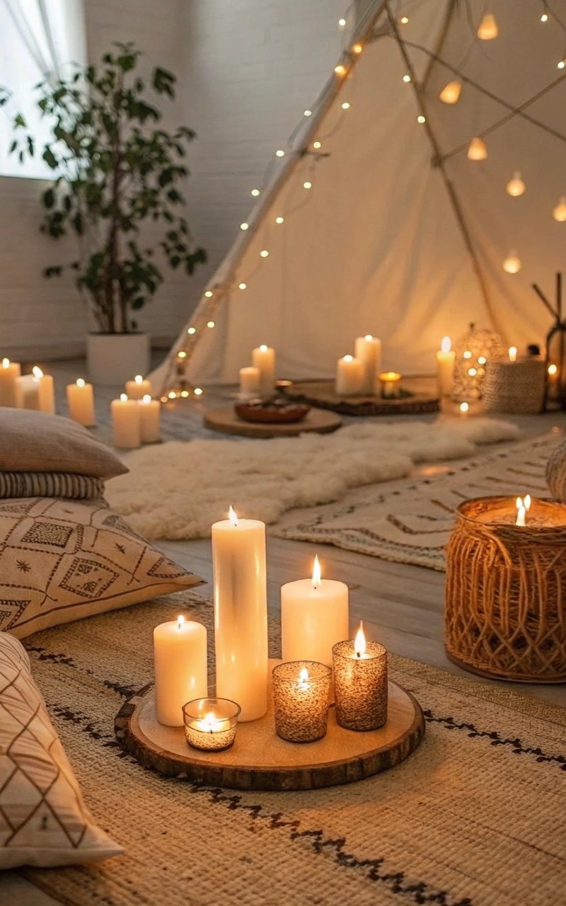 Grouping candles together created a warm, flickering glow that enhances the cozy atmosphere. The light feels intimate and calming. It adds depth to the space. The setup feels intentional. It’s simple, but powerful. Pro Tip: Use varying heights for visual interest.