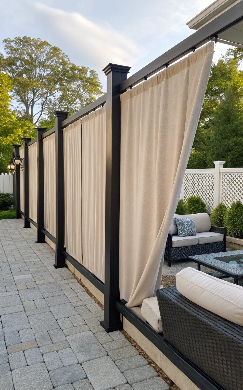 Using outdoor fabric as a fence might sound unusual, but it’s surprisingly effective. The soft, flowing material creates privacy while adding a relaxed, cozy feel. It’s quick to install and easy to change whenever you want a new look. I love how it moves with the breeze, adding a bit of life to the space. Isn’t it refreshing to try something a little different? This one’s flexible and budget-friendly.