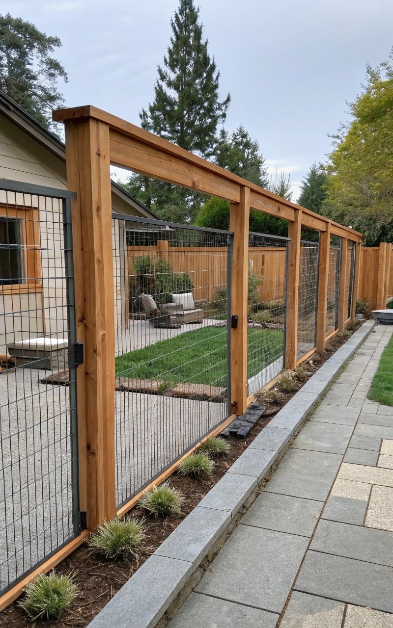 Combining wire with a wooden frame creates a fence that feels both sturdy and open at the same time. The contrast between natural wood and industrial wire gives it a modern yet rustic look that’s hard to beat. I like how it defines the space without completely blocking the view. It’s perfect if you want structure without feeling closed in. Have you ever wanted a fence that protects but still feels breathable? This one strikes that balance really well.
